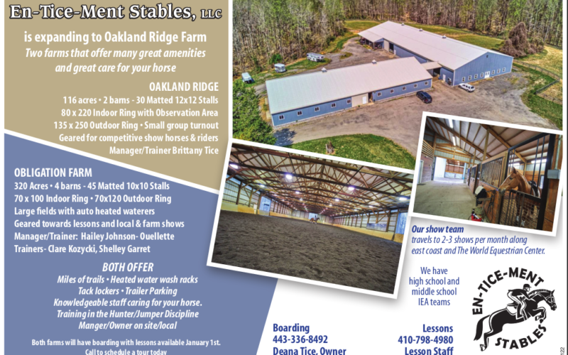 En-tice-ment Stables, LLC operates at Obligation Farm located in Harwood, Maryland, central to Annapolis, Baltimore & Washington DC areas. This facility is ideal for personalized learning in a beautiful country setting. We welcome children and adults whose level range from beginner to advanced horseman. Our lesson programs offer balanced seat equitation and hunter/jumper instruction by highly qualified instructors.